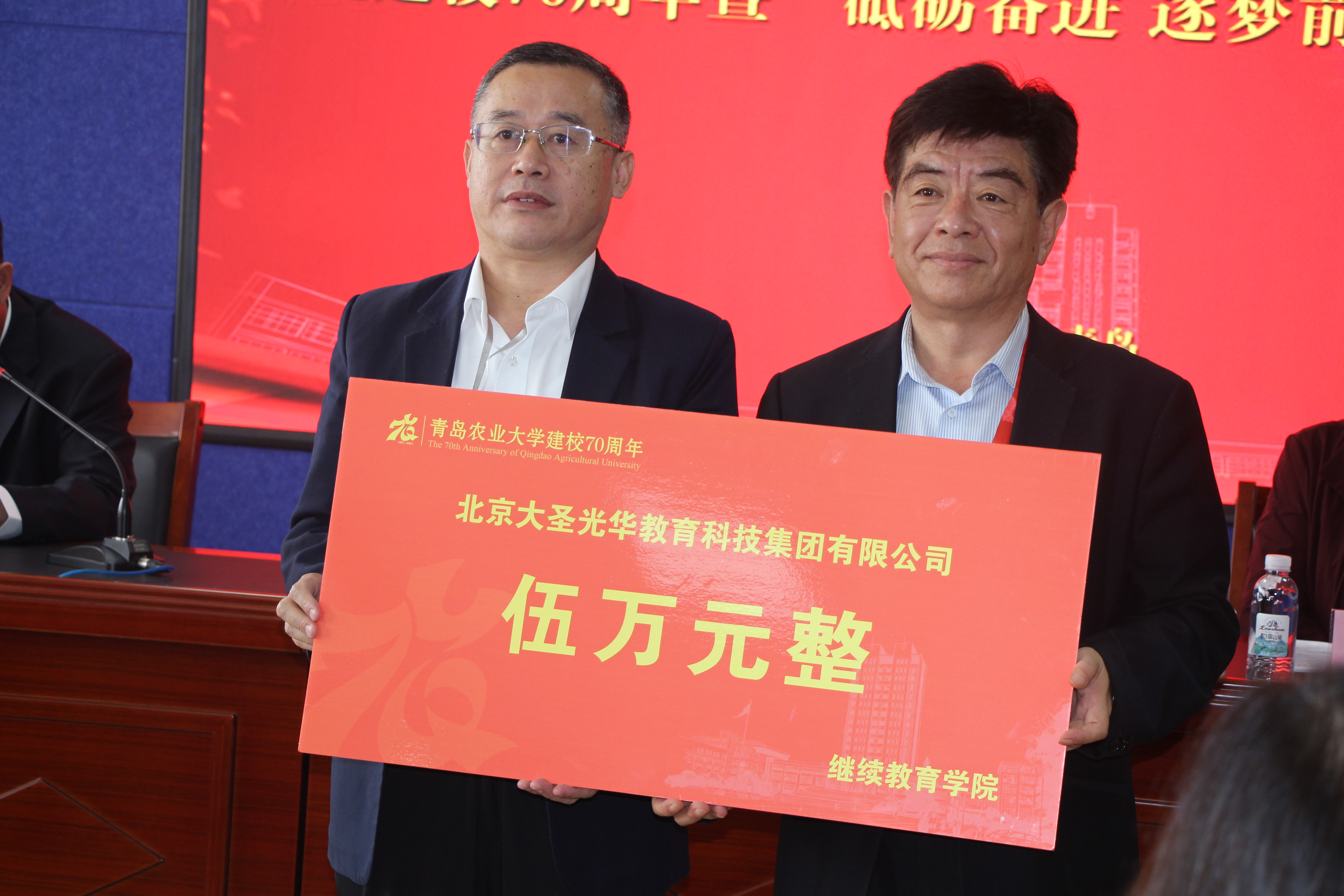 在捐赠仪式上,副校长田义轲代表学校接受北京大圣光华教育科技集团有限公司伍万元捐赠;李国梁为捐赠单位和校友颁发捐赠证书。