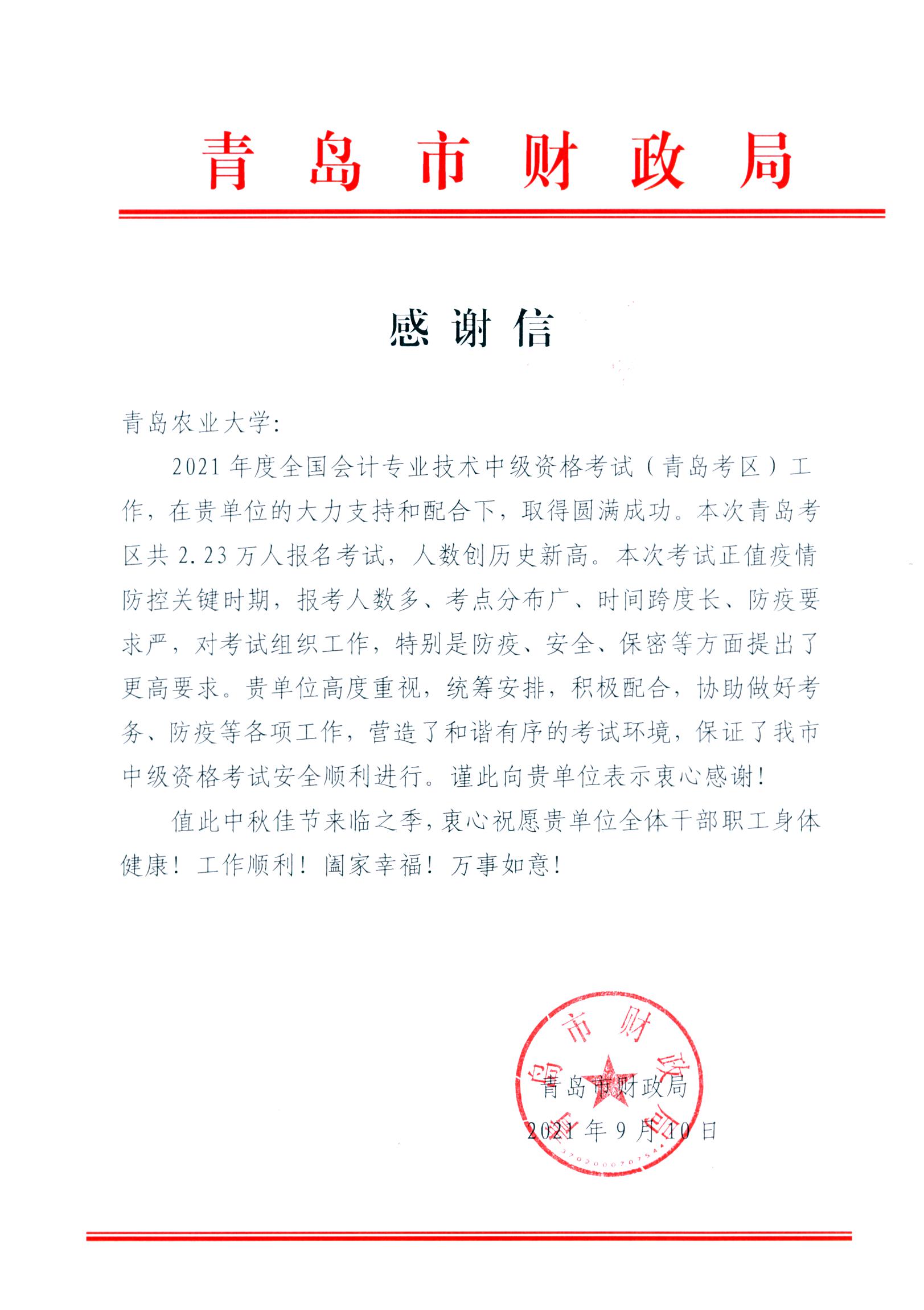 2021年9月10日,青岛市财政局向我校寄来感谢信,感谢学校对2021年度全国会计专业技术中级资格考试(青岛考区)工作的大力支持和配合。