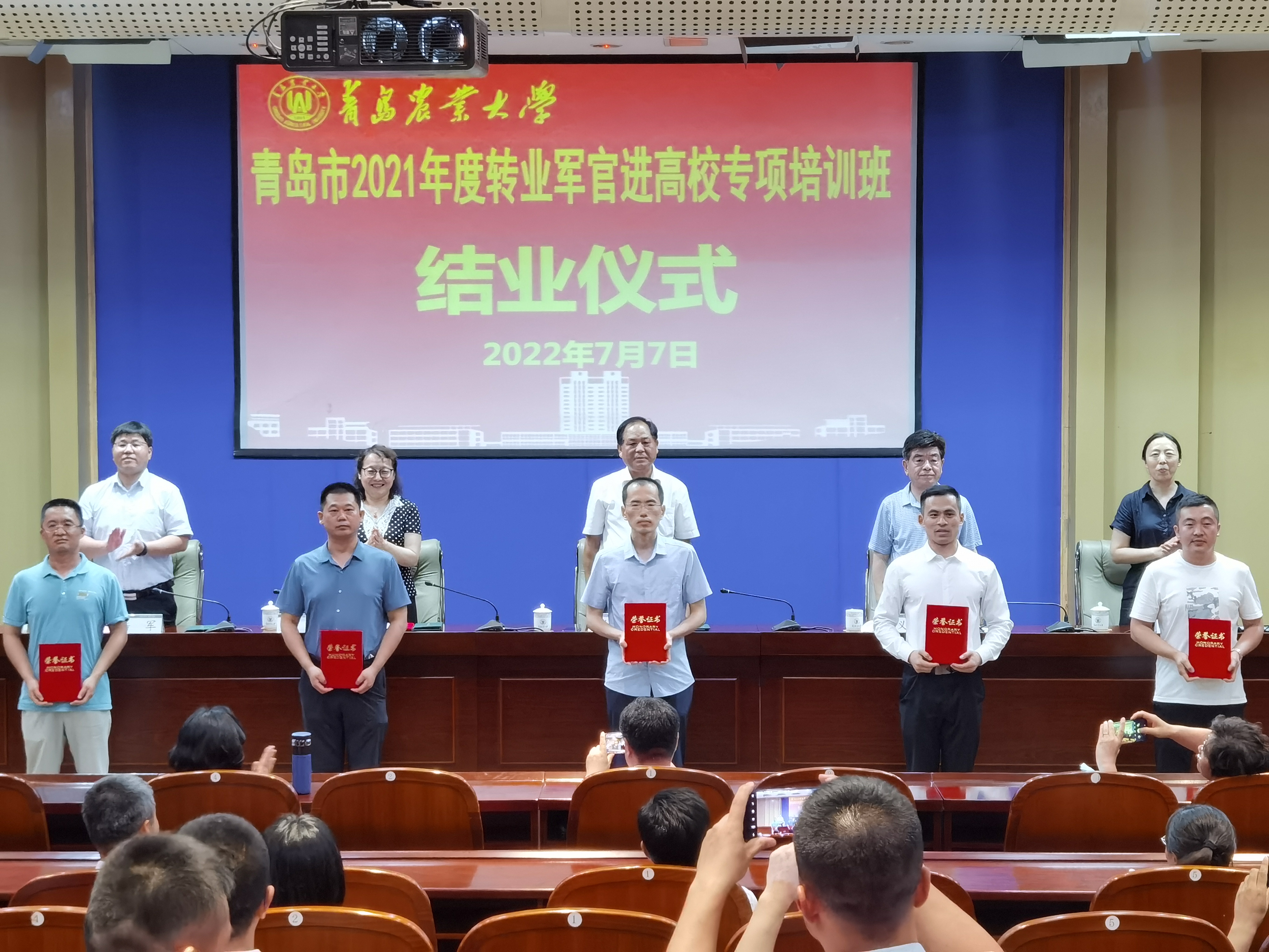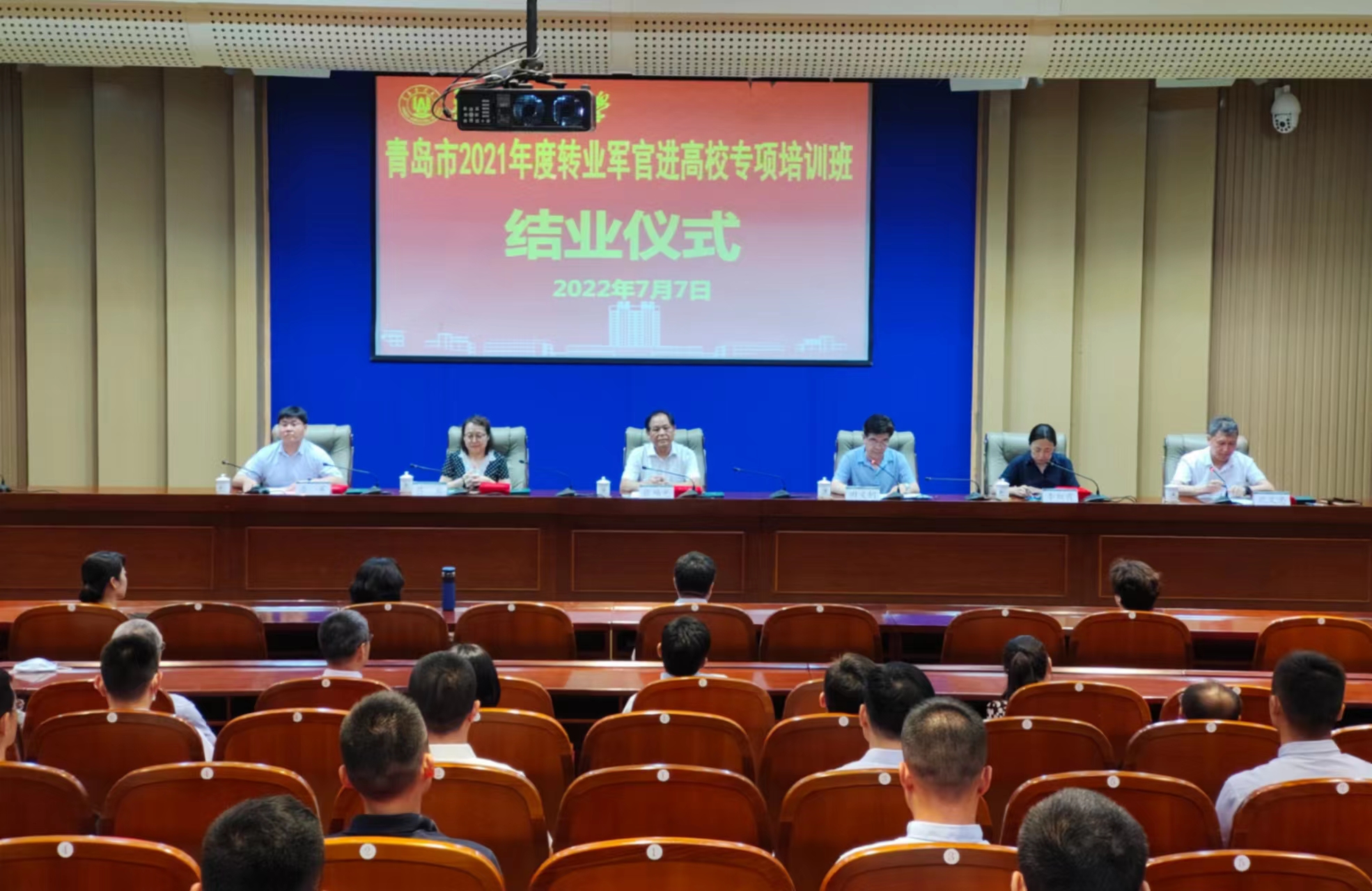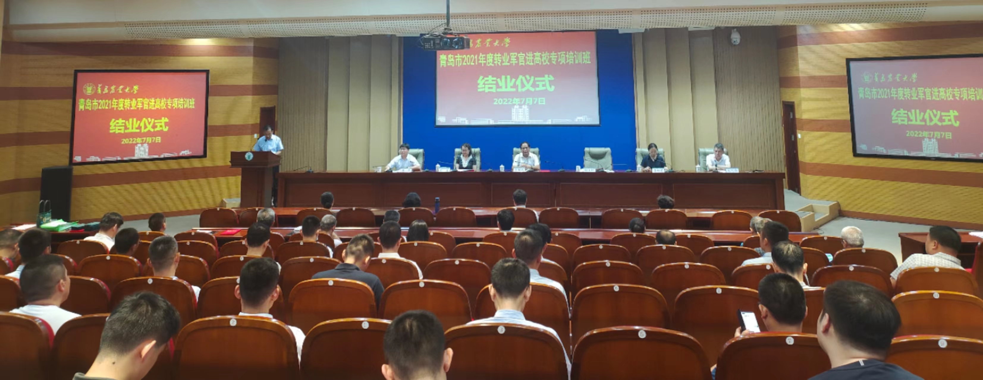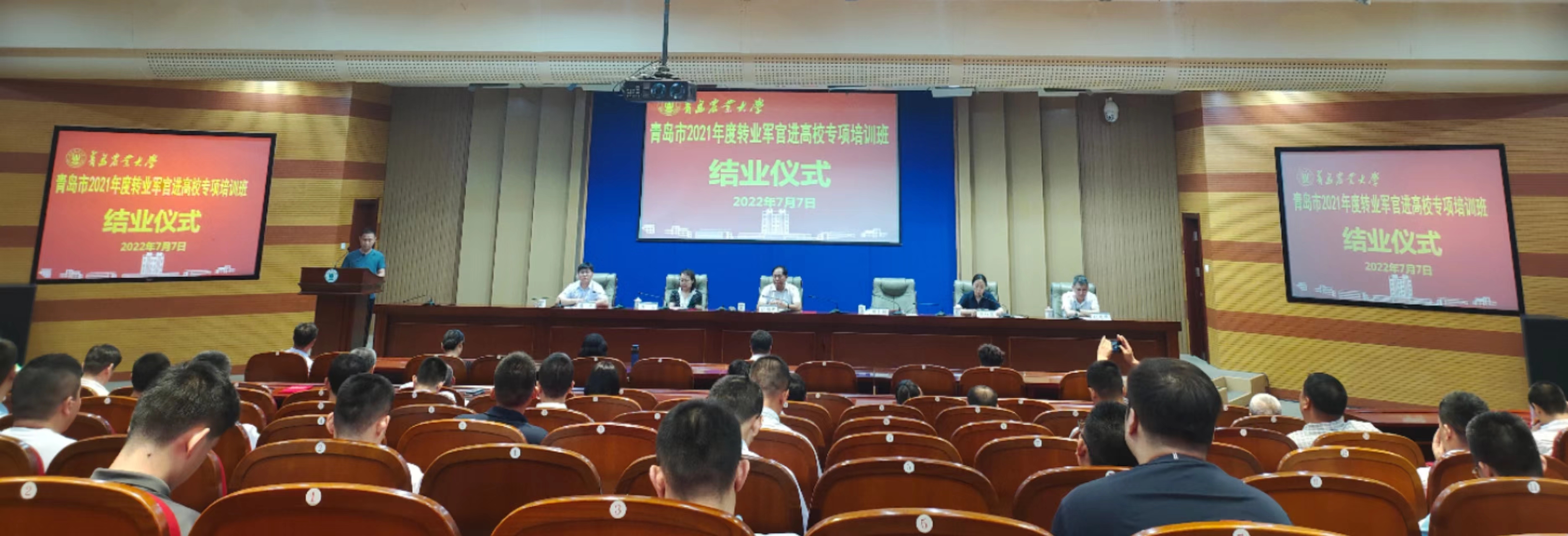 7月7日下午,青岛市第五期转业军官进高校专项培训班结业典礼在中国·太阳集团tyc9728学术会馆举行,副校长田义轲,青岛市退役军人事务局一级调研员张福光,太阳成集团tyc9728学院院长潘军,青岛市退役军人事务局移交安置处处长吕岩,青岛市退役军人事务局移交安置处副处长、二级调研员李红霞出席,青岛市退役军人服务中心副主任纪文忠主持。