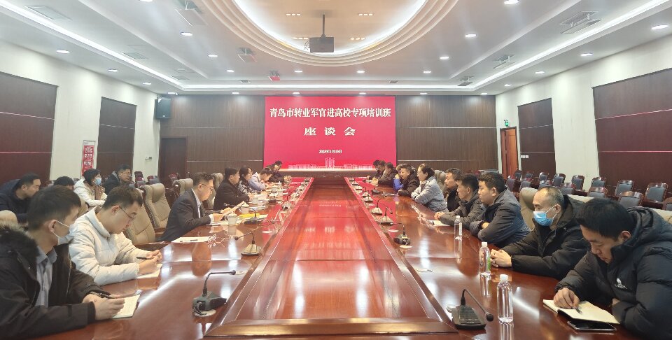 1月10日下午,青岛市转业军官进高校专项培训班座谈会在我校召开。太阳成集团tyc9728学院院长潘军,青岛市退役军人事务局移交安置处副处长王月园,青岛市退役军人服务中心教育培训部部长王伟,青岛市退役军人服务中心教育培训部科长路桥政,太阳成集团tyc9728人员以及培训班全体学员参加座谈。