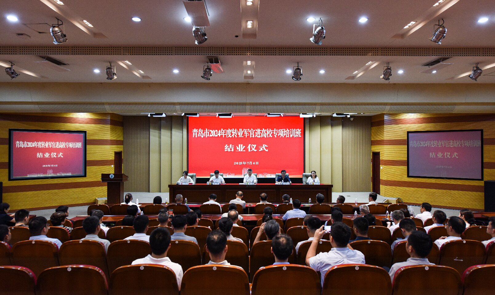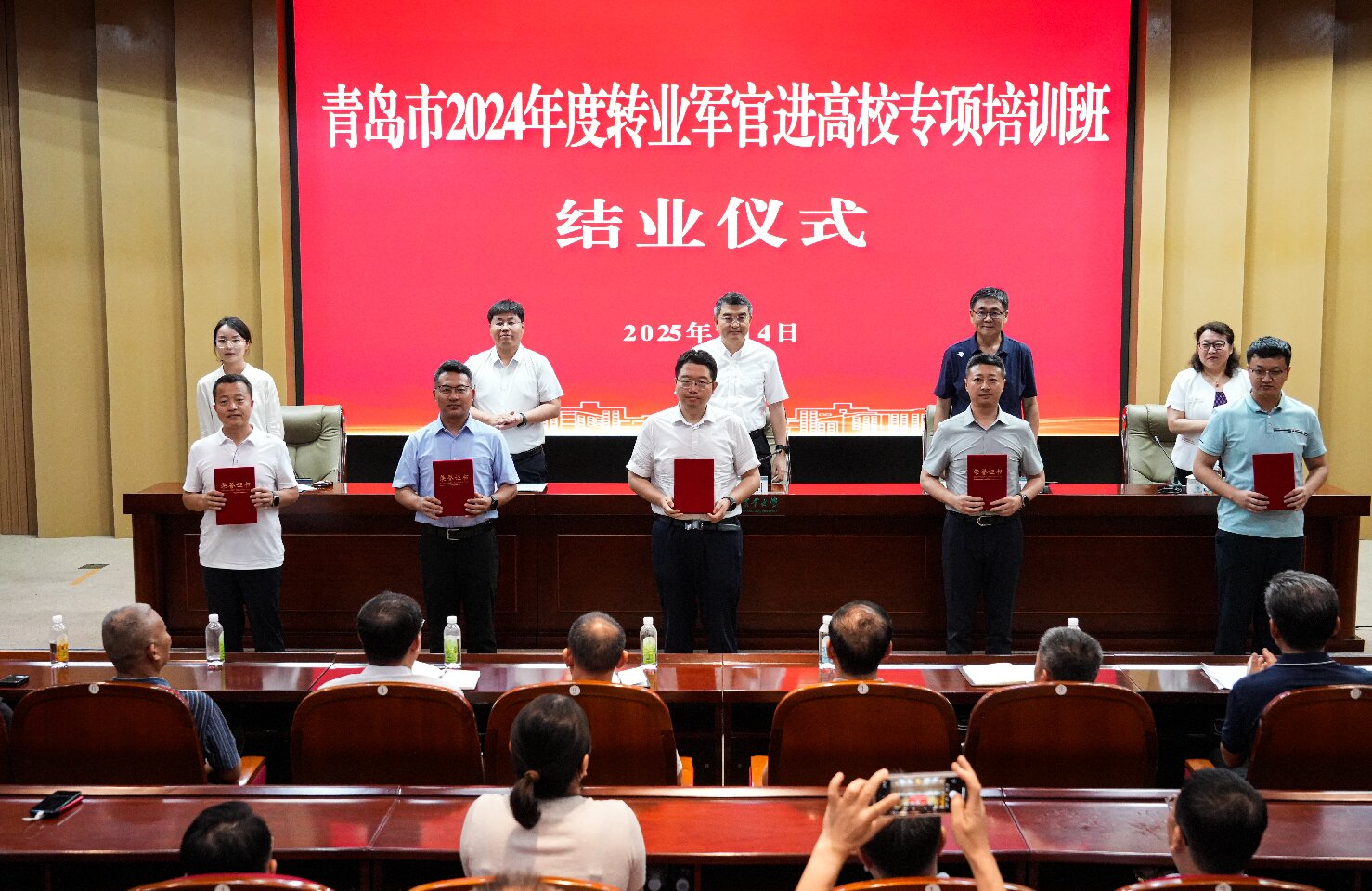 隋国武代表学校向出席结业仪式的各位领导表示诚挚欢迎和衷心感谢。隋国武表示,2025年是中华人民共和国成立76周年,是实现“十四五”规划目标任务的关键一年,学校坚持以习近平新时代中国特色社会主义思想为指导,全面贯彻落实党的二十大、二十届二中、三中全会精神和党的教育方针,深度聚焦国家国防和军队改革对转业军官培训工作的新要求,坚决扛起政治责任,不断创新思路,勇于探索实践,完善教育培训方式,提升教育培训质量,突出高校平台作用,发挥“以平台思维做乘法”效应,积极打造退役军人教育培训旗舰品牌,坚持做到“创新发展、系统发展、精准发展”三位一体有机衔接,为推动青岛退役军人管理服务工作高质量发展,助力学习型社会建设贡献积极力量,先后承担八期青岛市转业军官进高校专项培训任务,培训学员200余人。