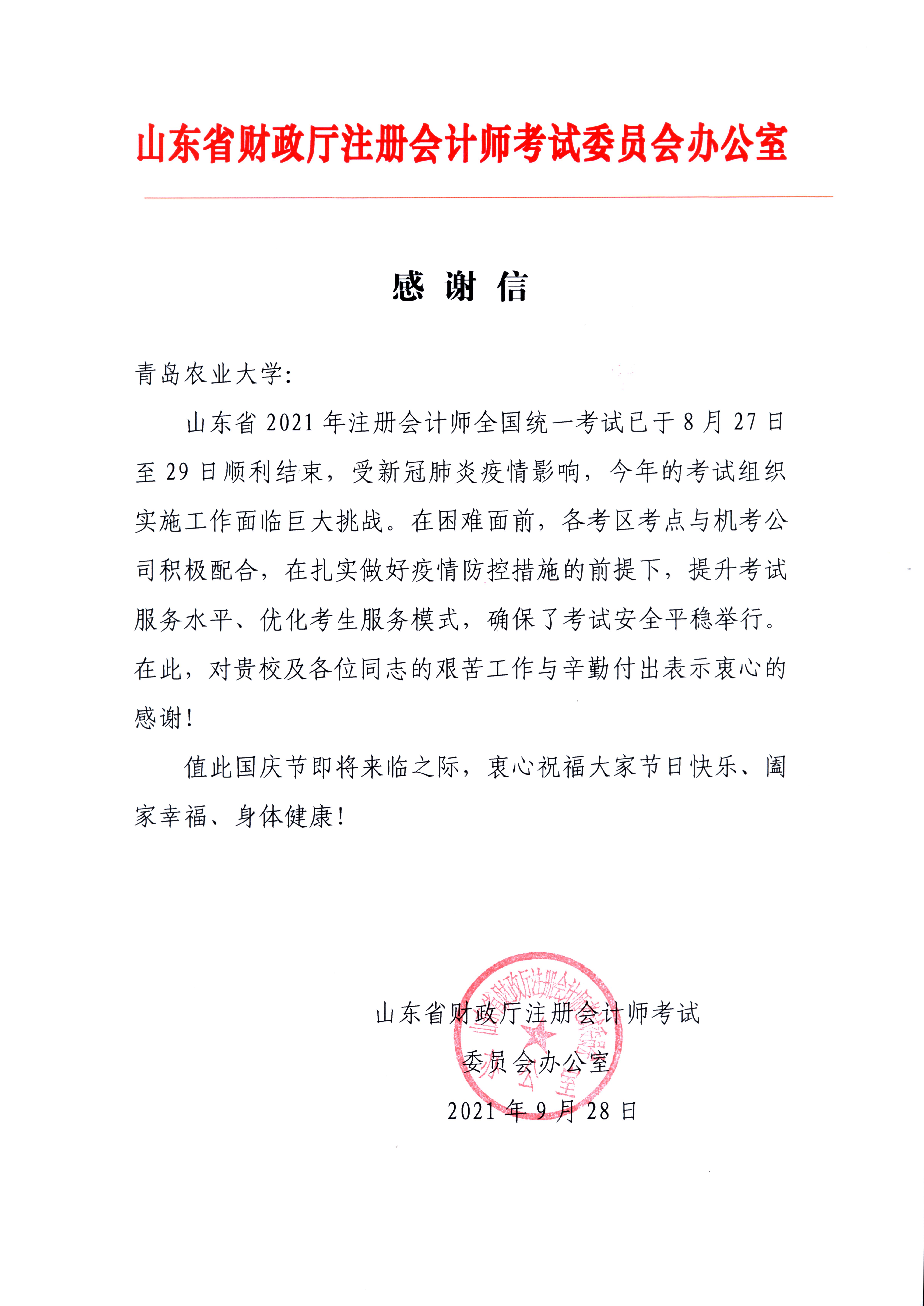 2021年9月28日,山东省财政厅注册会计师考试委员会办公室向我校寄来感谢信,感谢学校对山东省2021年注册会计师全国统一考试工作的大力支持和配合。