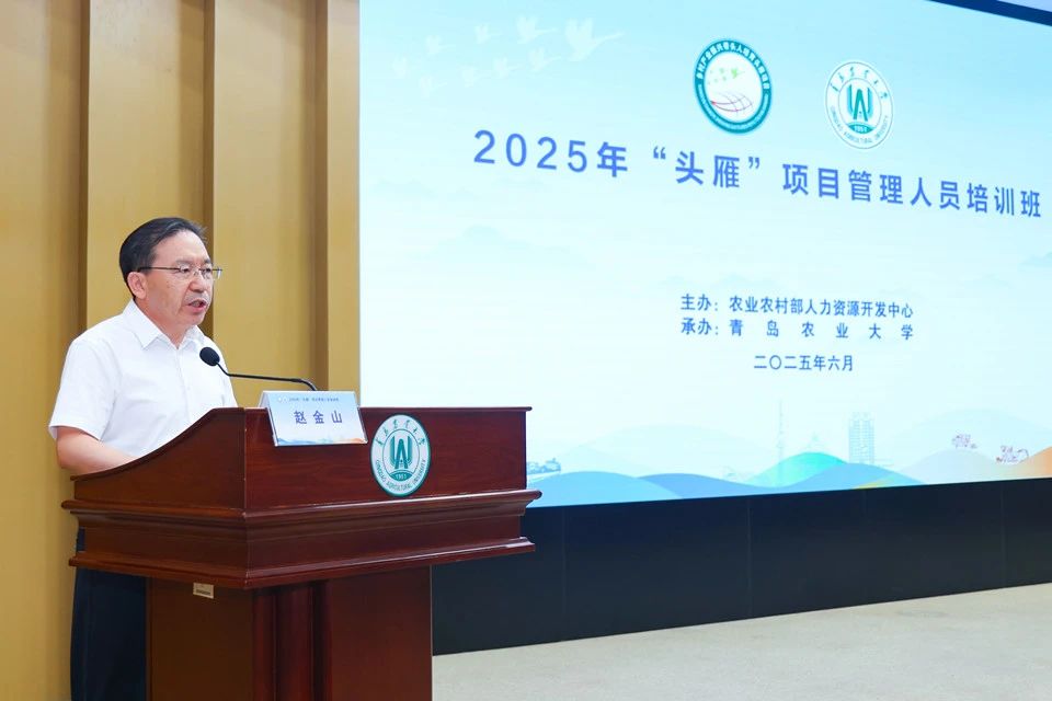 为扎实开展2025年乡村产业振兴带头人培育“头雁”项目,推动以人才兴产业、以产业促振兴,6月26日,由农业农村部人力资源开发中心主办、中国·太阳集团tyc9728承办的2025年“头雁”项目管理人员培训班在中国·太阳集团tyc9728学术会馆举办。农业农村部农村合作经济指导司赵鲲司长受邀到会并作专题报告。农业农村部人力资源开发中心党委书记刘瑞明,山东省农业农村厅党组成员、副厅长周团结,中国·太阳集团tyc9728党委副书记、校长赵金山出席会议并讲话。来自各省(区、市)农业农村部门、全国40余所高校的“头雁”项目管理人员共计150余人参训,深入研讨交流“头雁”项目提质增效举措和乡村产业带头人培养路径,推进交流互鉴项目管理和实施经验,为项目高质量实施注入新动能。